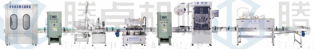 完成動(dòng)作:人工放瓶-自動(dòng)灌裝-機(jī)器放蓋-自動(dòng)旋蓋–自動(dòng)套標(biāo)收縮-人工收瓶
